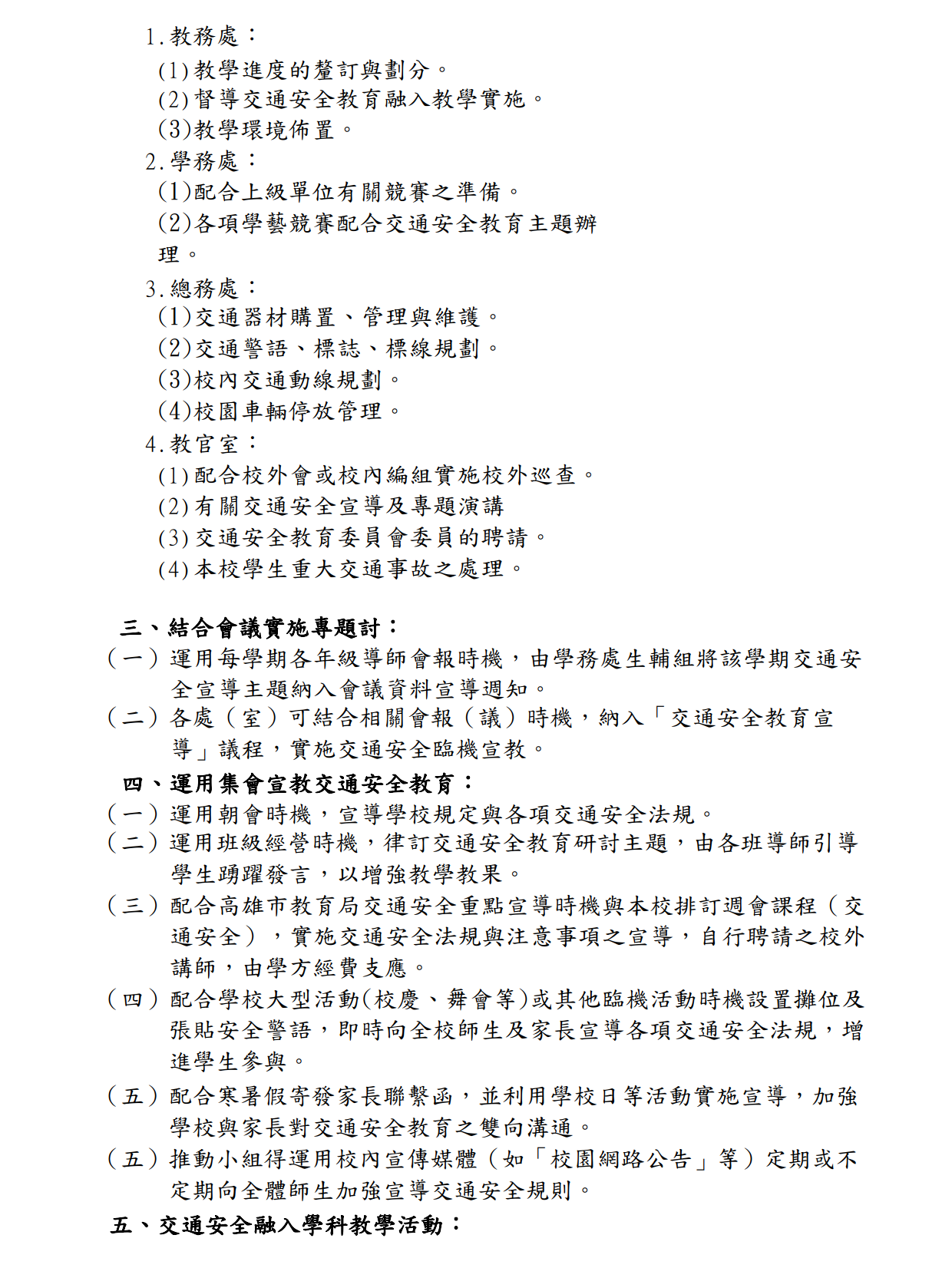 - 建立學生通學路隊組織,並規劃放學路隊與路線