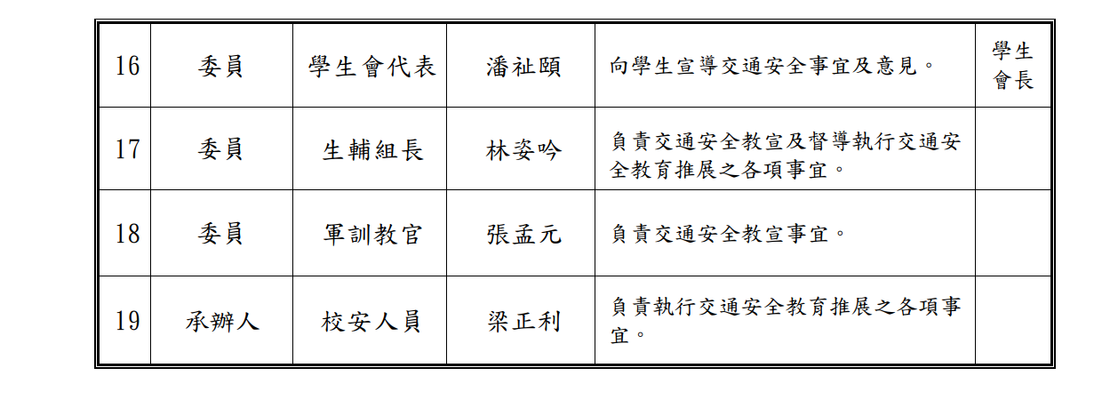 - 輔導學生社團,結合社區並運用社區各種資源,推展交通安全教育、宣導工作