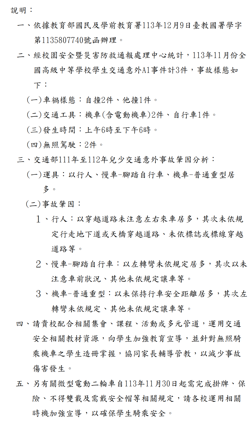 交通意外事件分析報告 / 113年 校安通報交通意外事件分析報告總集 / 113年11月份全國高級中等學校學生交通意外A1事件樣態及111至112年兒少交通意外事故肇因分析
