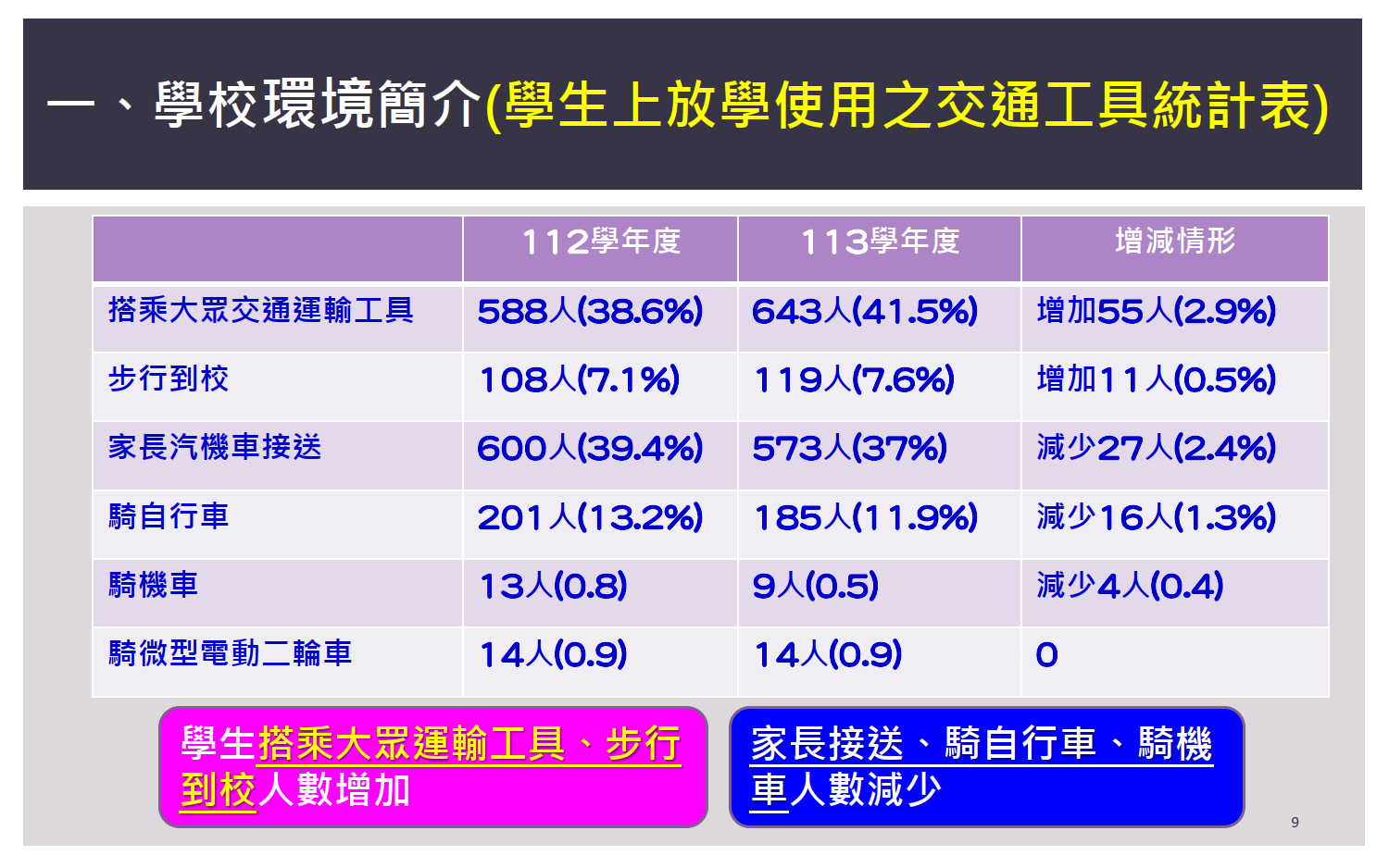 交通安全教育訪視專區 / 學校環境簡介 / 學生上放學使用之交通工具統計表