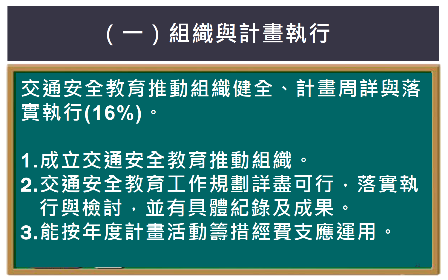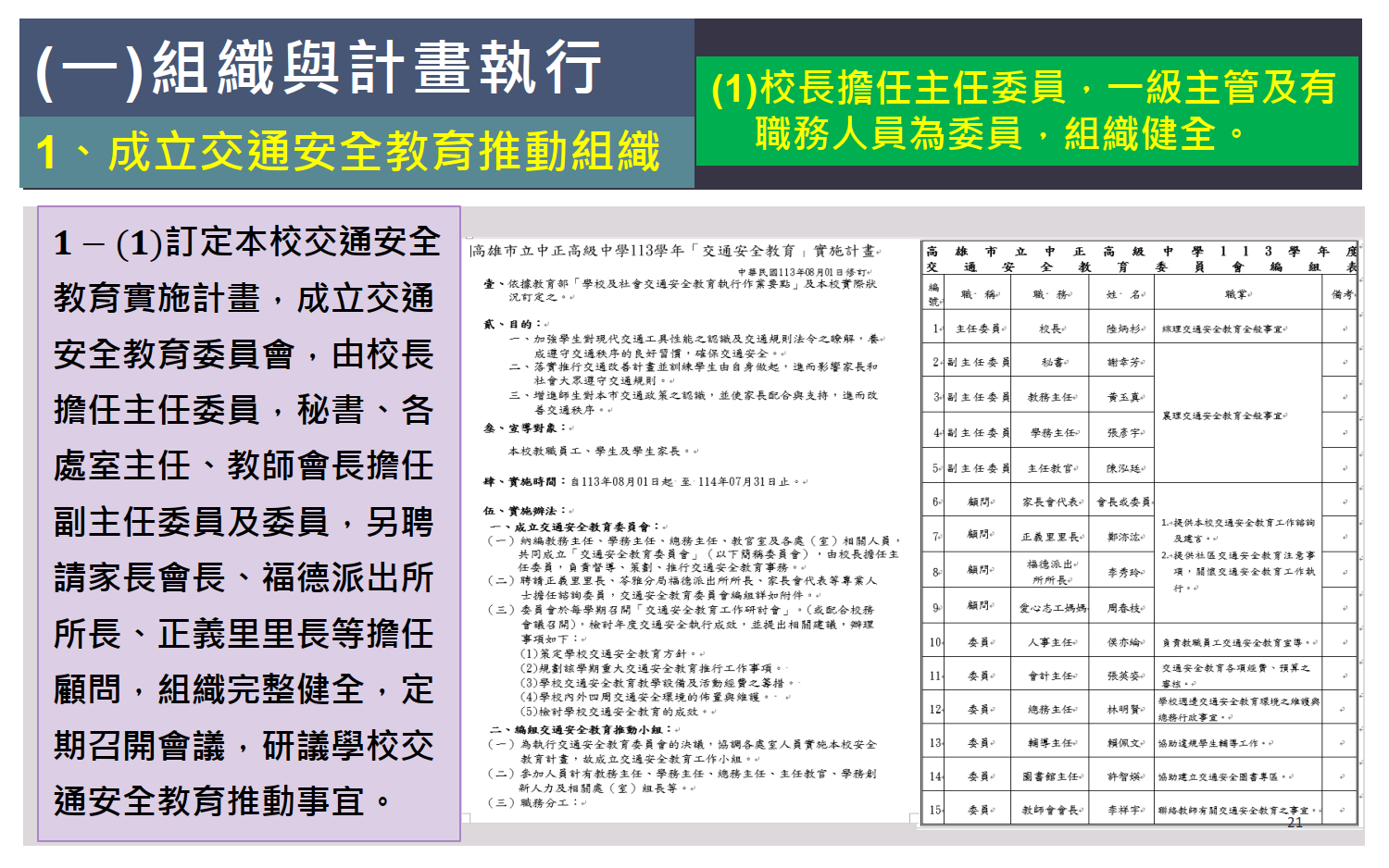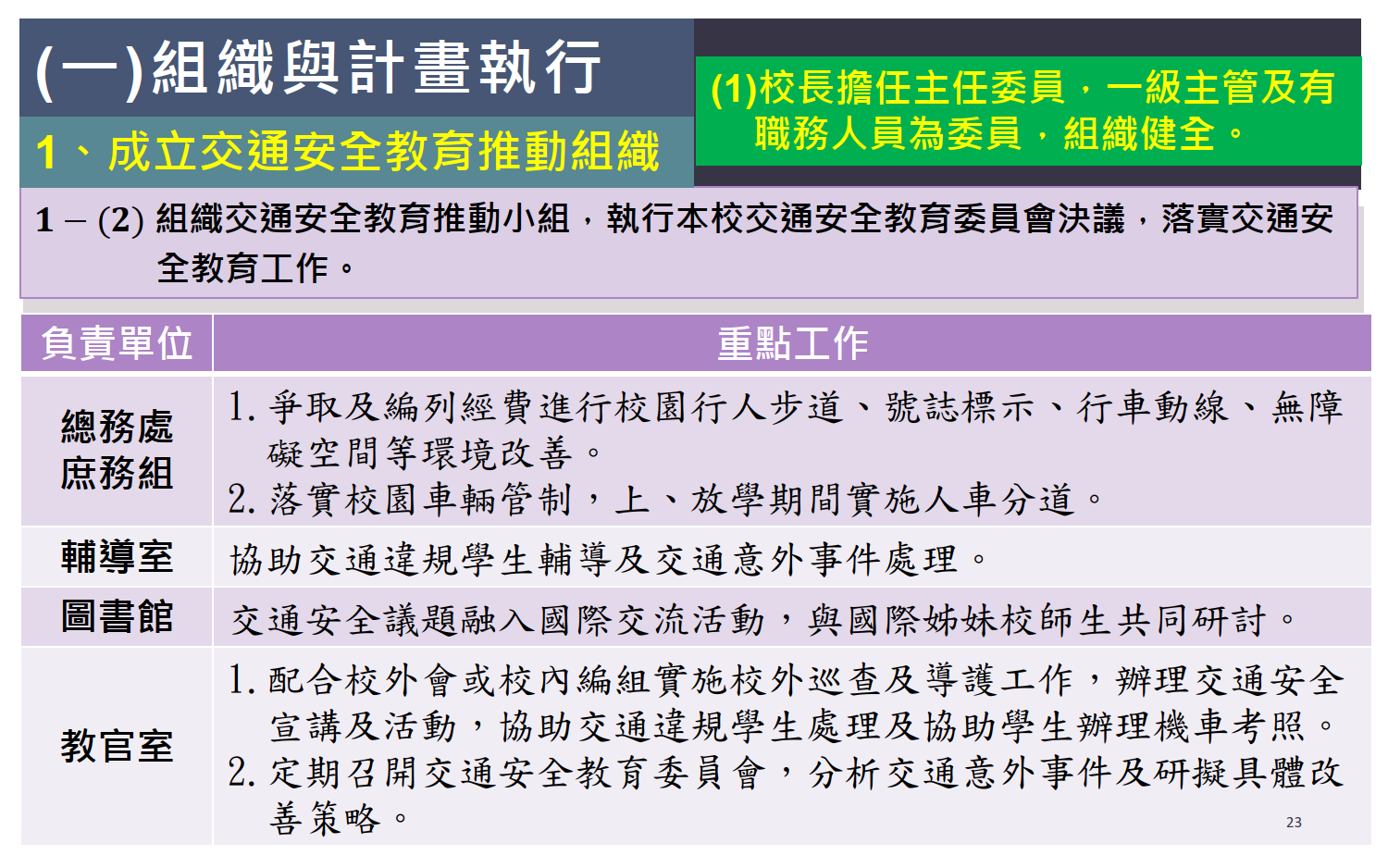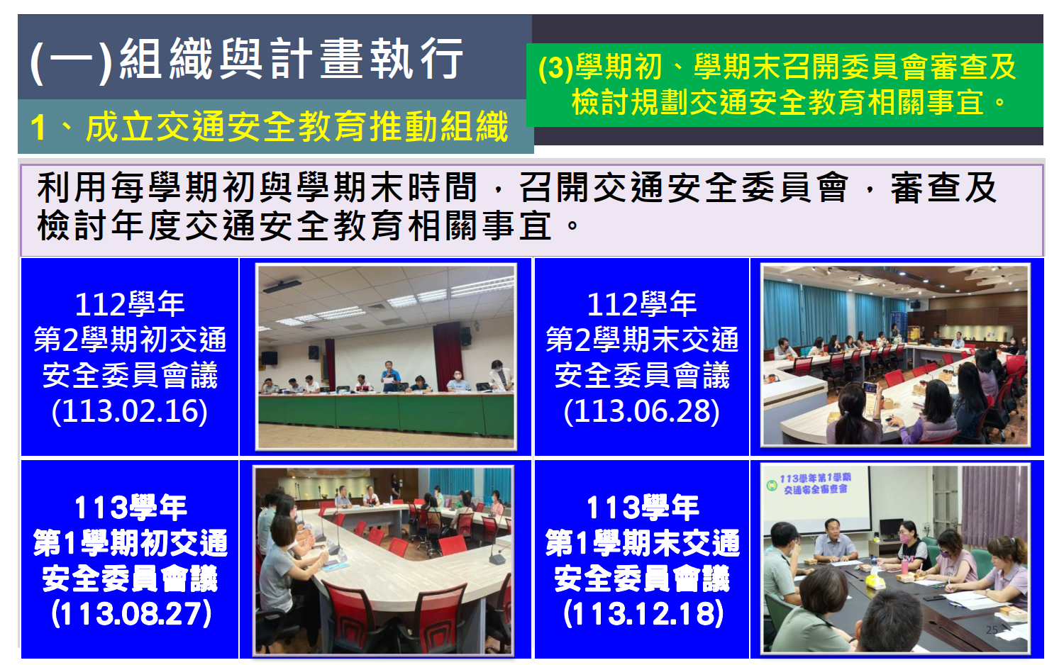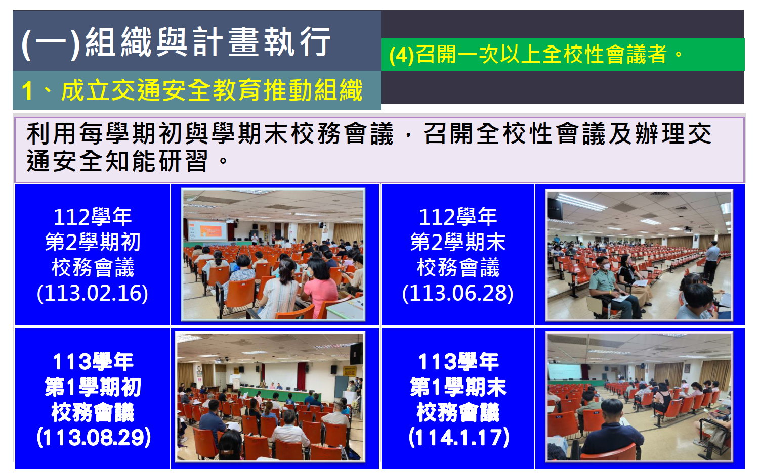 - 編撰交通安全教育教案並呈現教 學單元進度表,且有教學活動、 成效考核分析及輔導紀錄