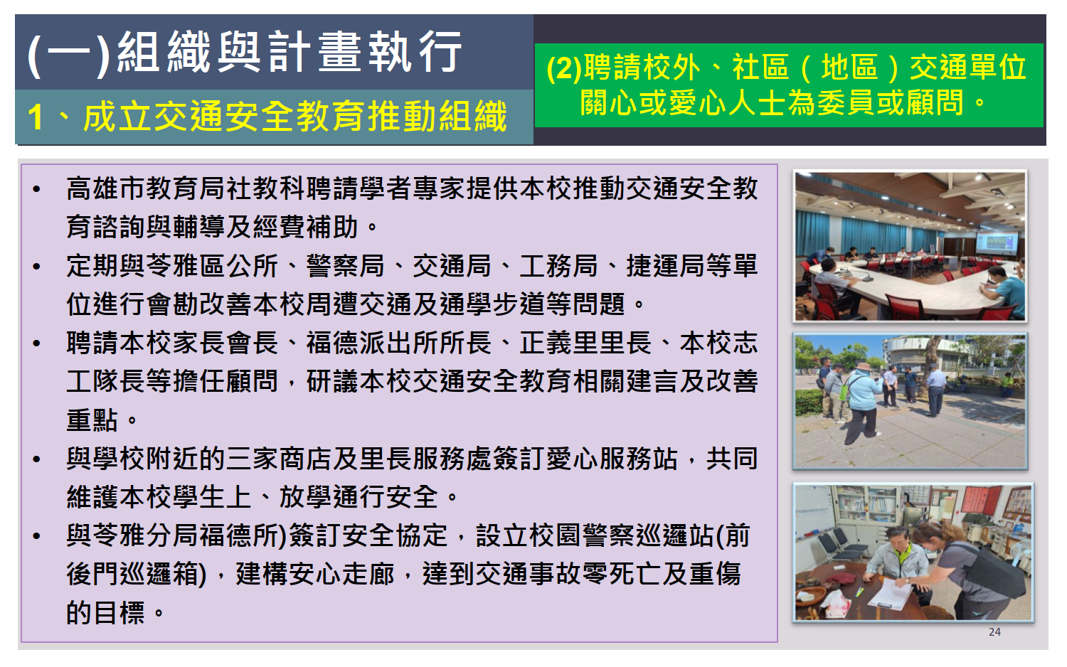 - 輔導學生社團,結合社區並運用社區各種資源,推展交通安全教育、宣導工作