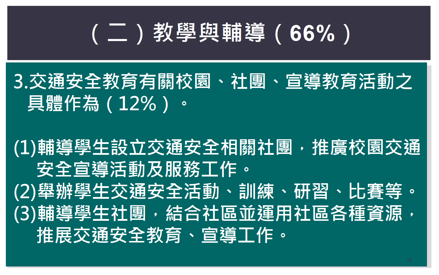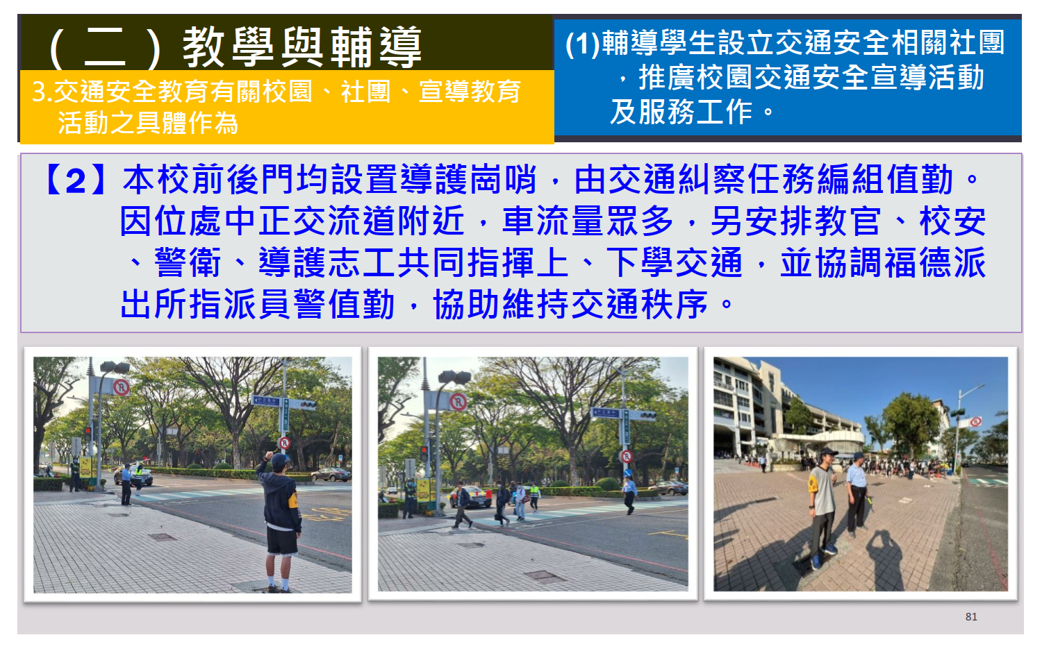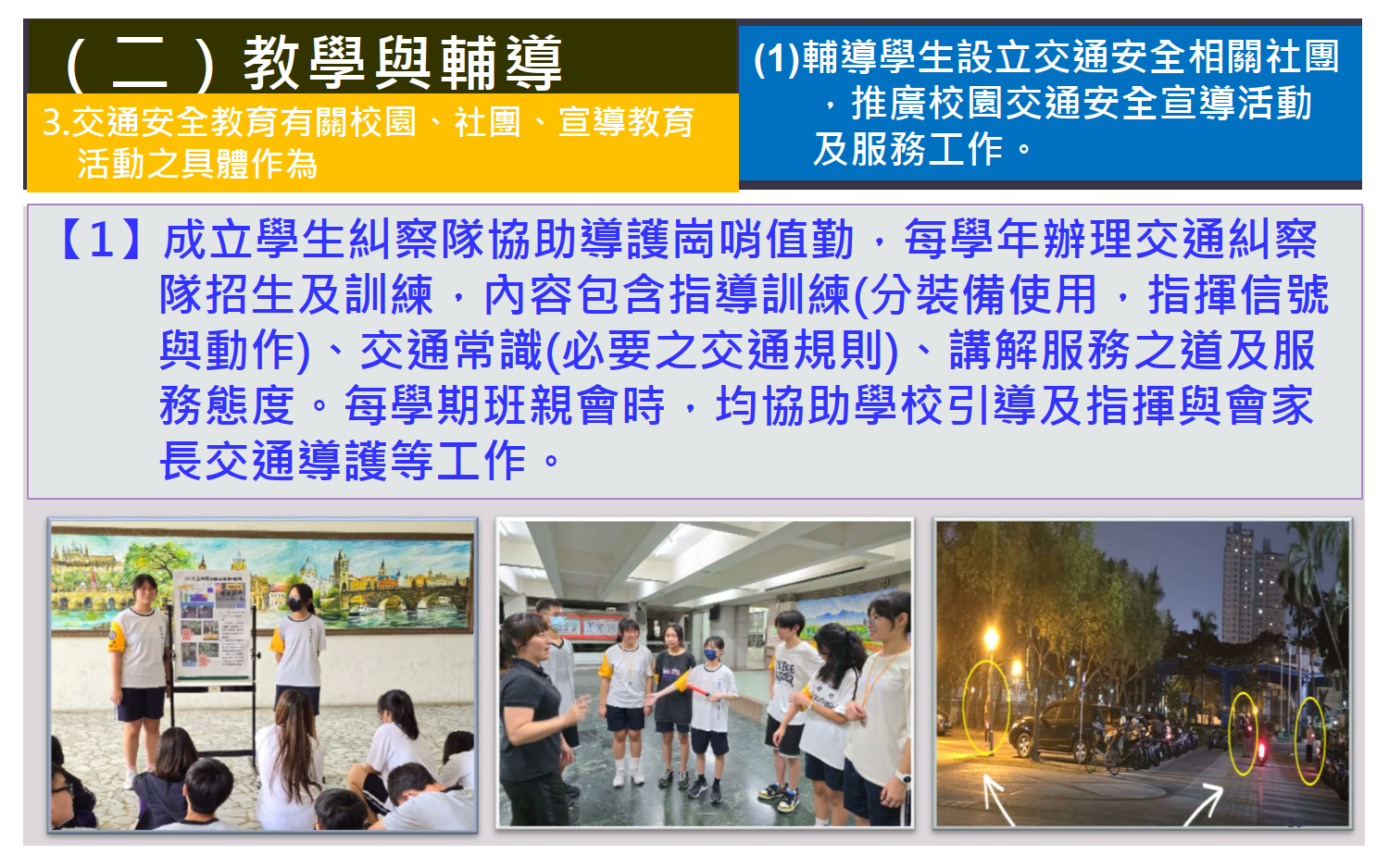 交通安全教育訪視專區 / 評鑑內容 / (二)教學與輔導 / 輔導學生設立交通安全相關社團 ,推廣校園交通安全宣導活動 3.交通安全教育有關校園、社團、宣導教育 及服務工作