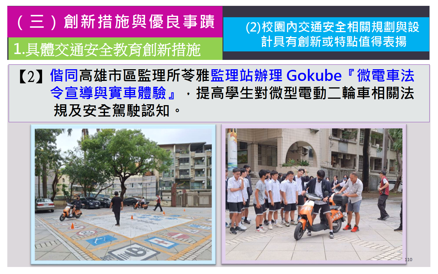 - 輔導學生設立交通安全相關社團 ,推廣校園交通安全宣導活動 3.交通安全教育有關校園、社團、宣導教育 及服務工作
