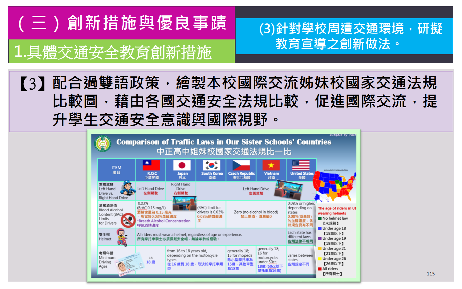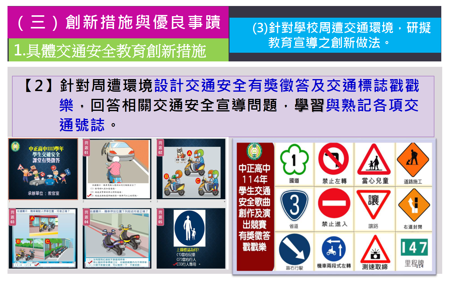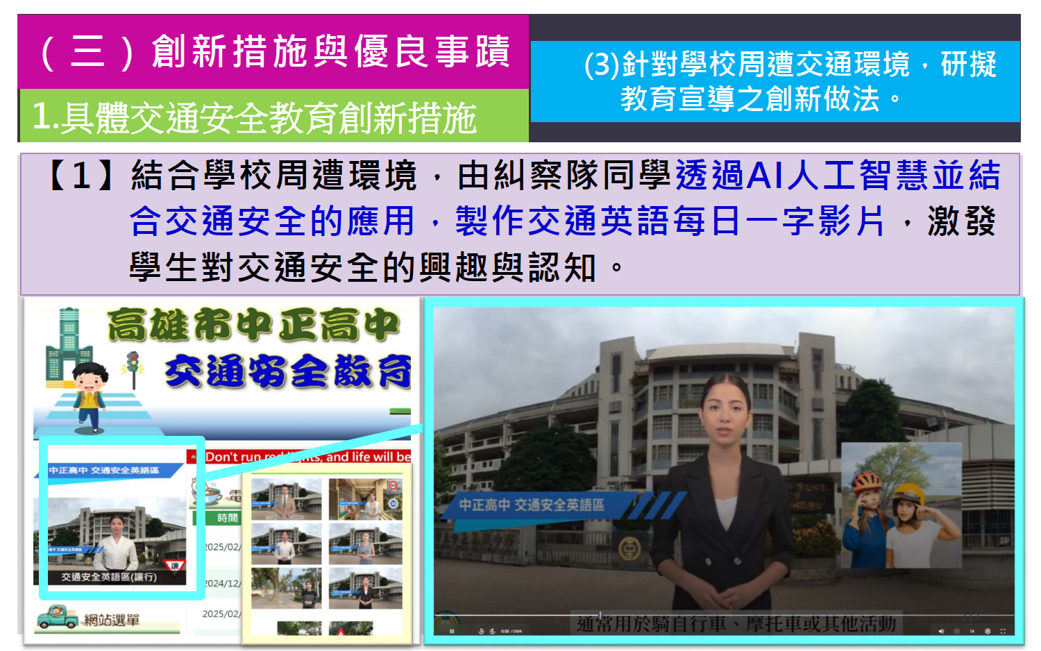 交通安全教育訪視專區 / 評鑑內容 / (三)創新措施與優良事蹟 / 針對學校周遭交通環境,研擬教育宣導之創新做法